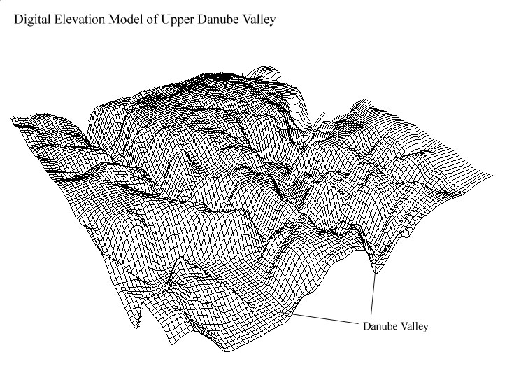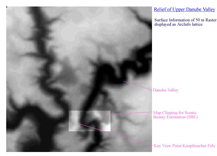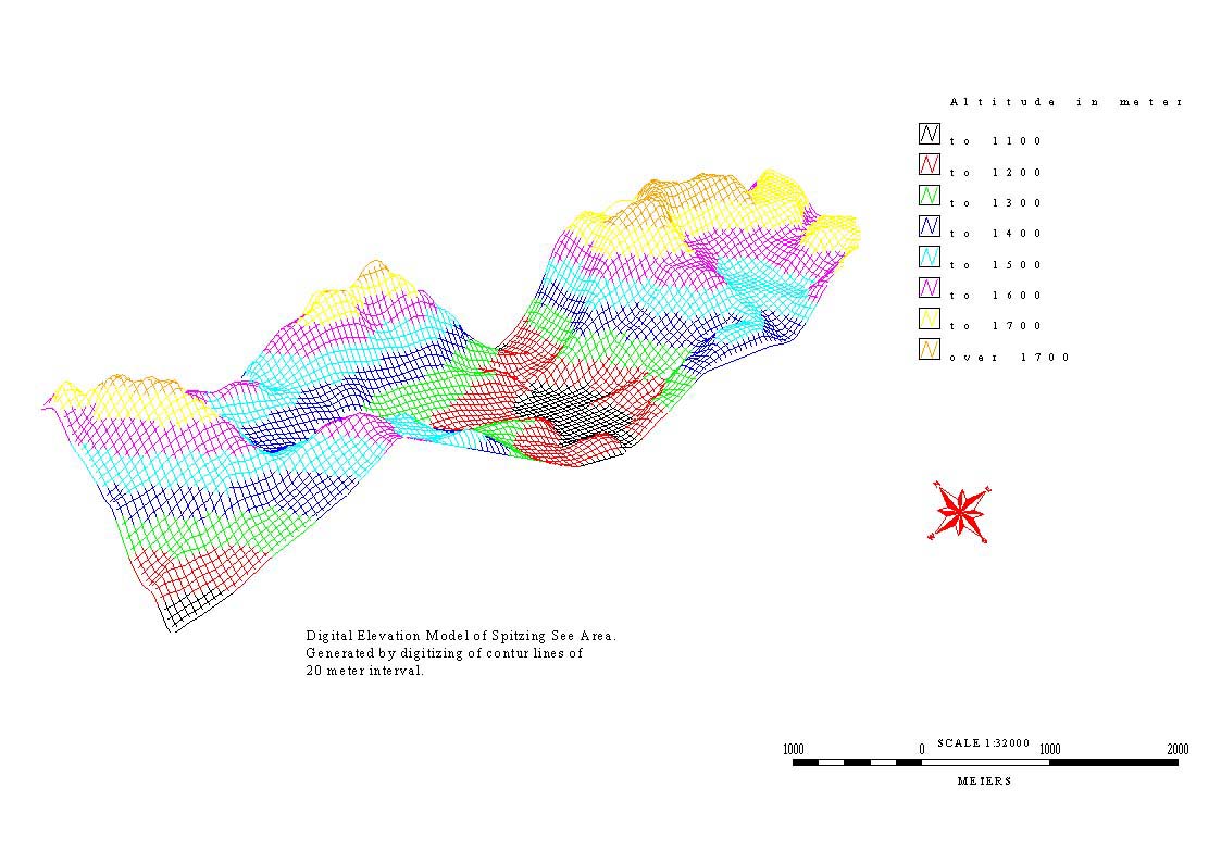 The Topopgraphical Map 1:25.000 (map03.jpg) was scanned and georeferenced for digitizing the 20 m contour lines and geodesic points of altitude. A tin was generated with the arctin command in ArcInfo. Alternatively different snap options (optimum at a weed tolerance of 20 m) and the createtin command, which reads either points or arcs, were tested. The tin can be displayed in arcplot in different modes, aspects and surfaceshades, e.g. as: